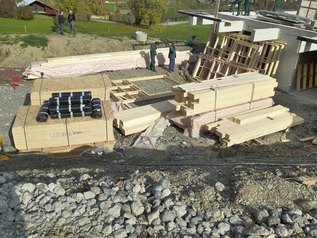 Arrivée du premier camion ( murs, solives, poutres, charpente ) et début du montage